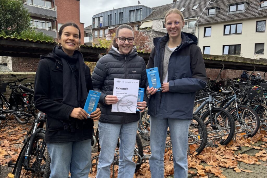 In der vergangenen Woche wurden die drei radaktivsten Schülerinnen ausgezeichnet: Marit (10c), Josefine (EF) und Paula (10b) erhielten von Herrn Juntermanns jeweils eine Fahrrad-Handyhalterung als Preis.