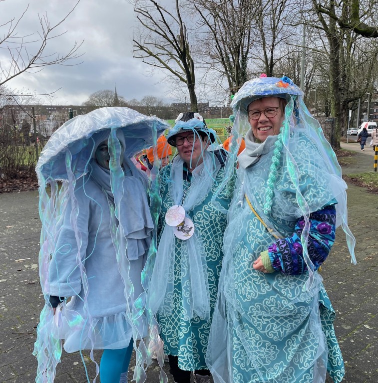 In der Karnevals-AG trafen sich vor Weihnachten 25 Schülerinnen und Schüler, um die Kostüme für den diesjährigen Karnevalszug auszusuchen. Es sollten Wassertiere werden und so wurden Anfang Januar die Stoffe für Kraken, Clownfische und Quallen zugeschnitten und in Feinarbeit mit der Hand und der Maschine im Kunstraum genäht.