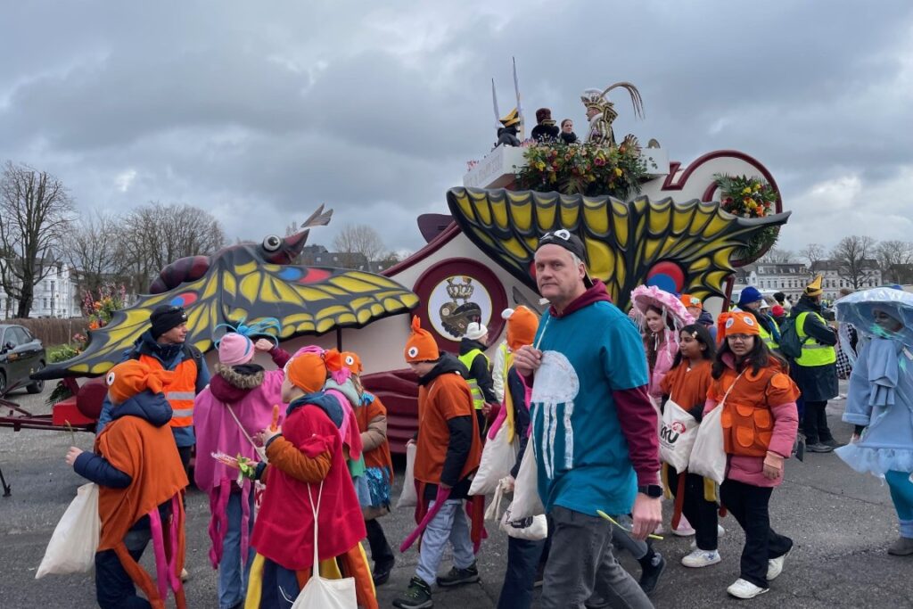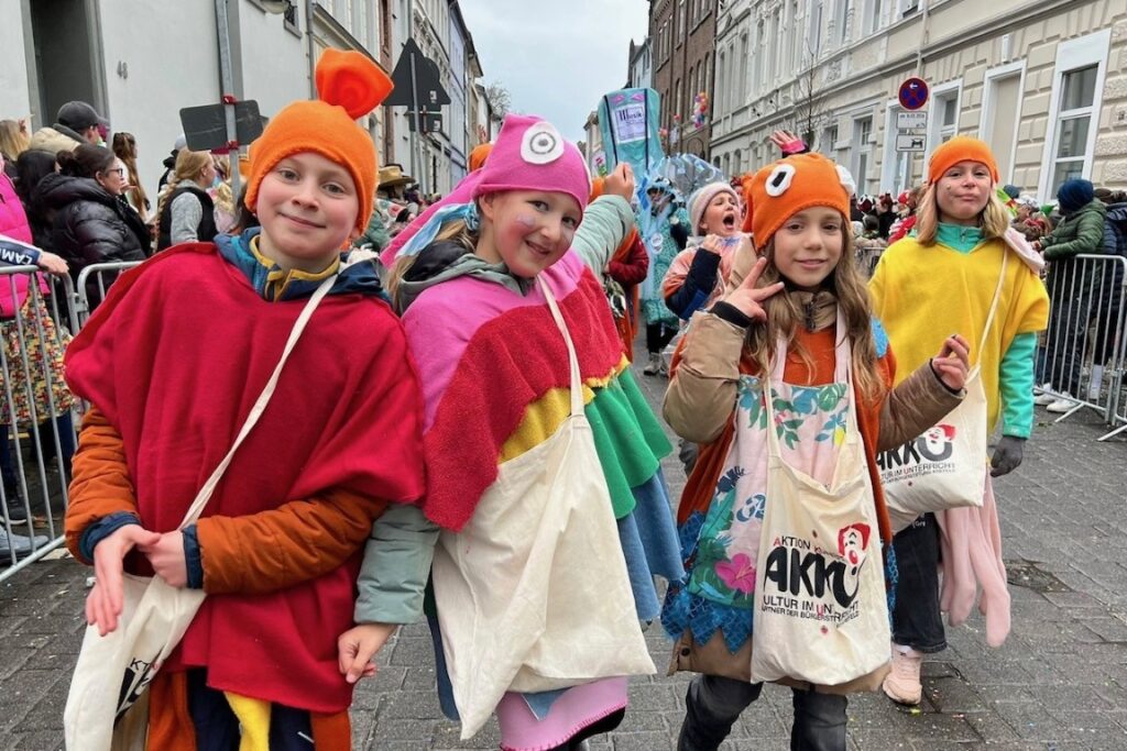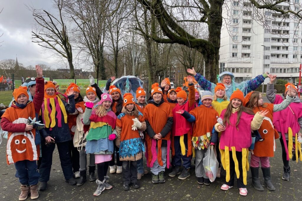 Alle Kinder aus den beteiligten Schulen hatten Meerestiere in Orangetönen gestaltet, die Erwachsenen waren in Blau, meistens als Quallen, zu bewundern, sodass sich ein großer farbiger Schwarm bildete. Große und viele kleine Karnevalisten aus sechs verschiedenen Schulen und Einrichtungen folgten in diesem Jahr einem eigenen Wagen, der das Motto „Gemeinsam sind wir stark“ (Geschichte vom Fisch „Swimmy“) präsentierte, von Thomas Jansen (Mobifant) kunstvoll als Fischschwarm in knalligem Rot gestaltet. Alle Kinder hatten sehr viel Freude, die Kamelle zu werfen, „Helau!“ zu rufen und in fröhliche Gesichter am Straßenrand zu schauen. Dies ist eine schöne Art das Brauchtum Karneval hautnah mitzuerleben und weiterzutragen, denn die meisten freuen sich schon auf den nächsten Rosenmontagszug!