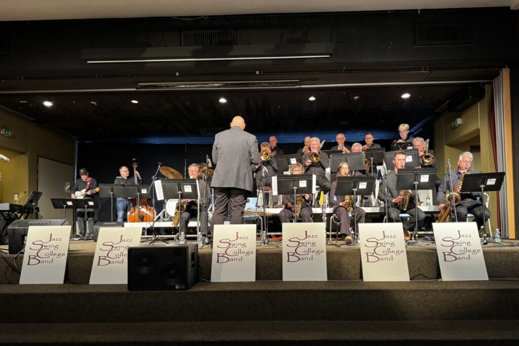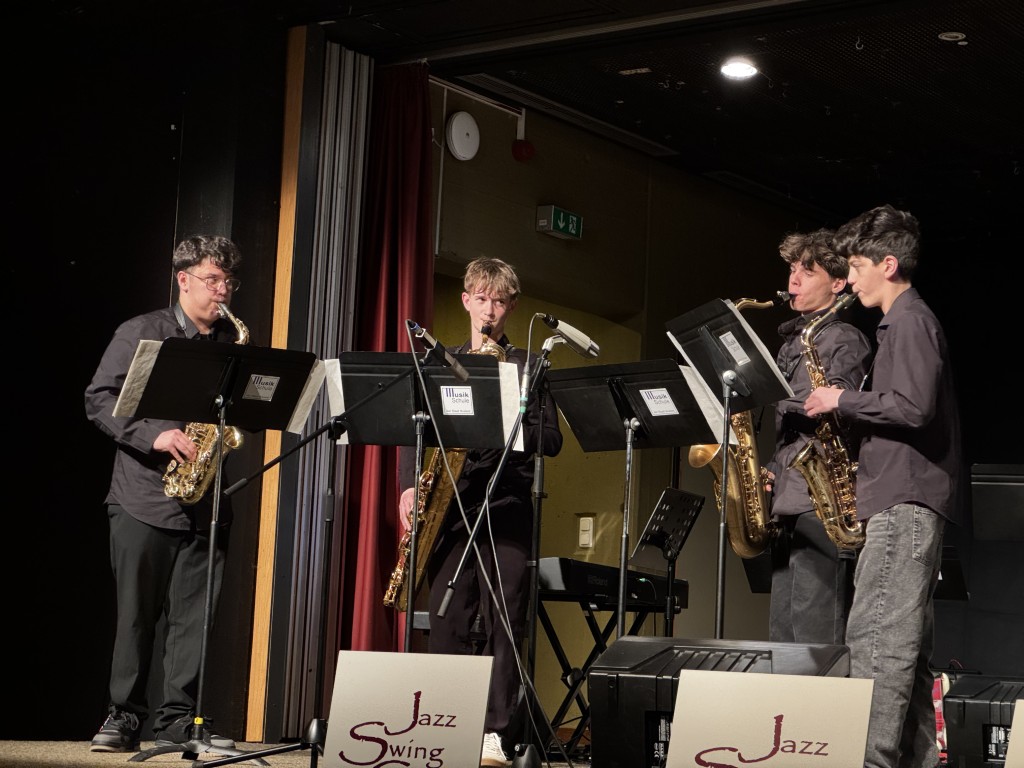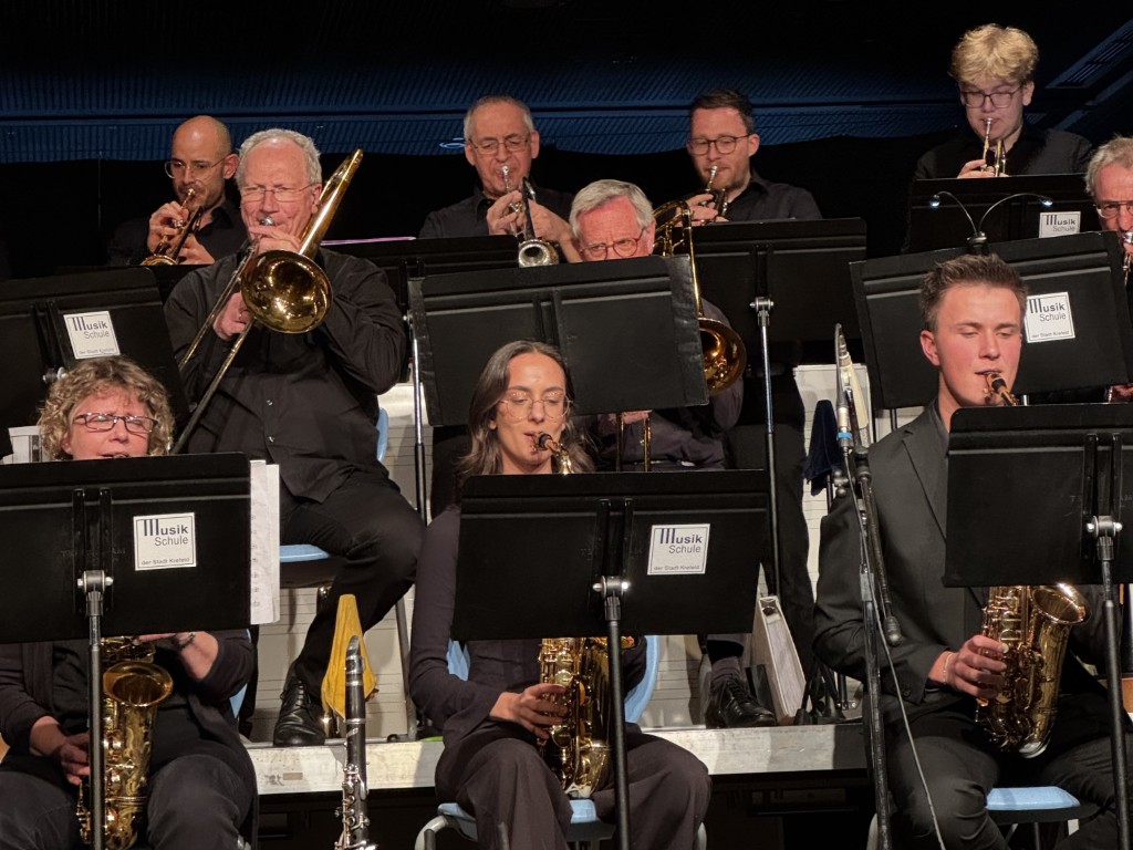 Die Big Band der Musikschule hat am vergangenen Dienstag unserer Schule eine Benefizkonzert geschenkt. In der Aula der Montessori-Gesamtschule ließen die Musiker unter der Leitung von Oliver Hirschegger stimmungsvollen Jazz vor einem Publikum von Eltern, Schülern und Kollegen hören. Unser ehemaliger Kollege Werner Lichtenberg hatte den Kontakt vermittelt und spielte selbst mit – als Posaunist.