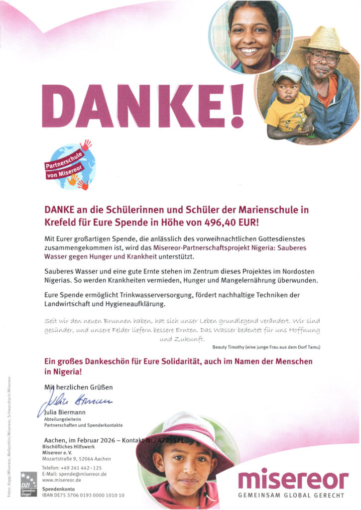 Im Vorweihnachtsgottesdienst am 19.12.2025 wurde für unser Misereor-Partnerprojekt „Mit sauberem Wasser gegen Hunger und Krankheit für Nigeria“ die beeindruckende Summe von 496,40 Euro von unserer Schulgemeinschaft, insbesondere von vielen Schülerinnen und Schülern gespendet. Dafür bedankt sich unser Kooperationspartner, das bischöfliche Hilfswerk Misereor herzlich.