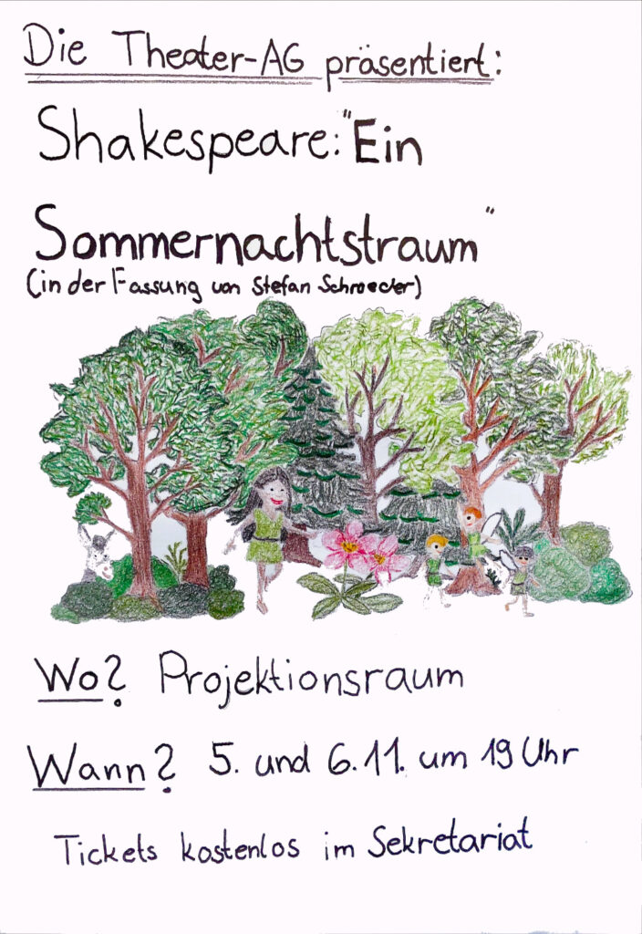 Die Theater-AG zeigt am kommenden Mittwoch und Donnerstag jeweils um 19 Uhr das Stück „Ein Sommernachtstraum“ in einer modernen Fassung. Es ist ab Klasse 5 geeignet.