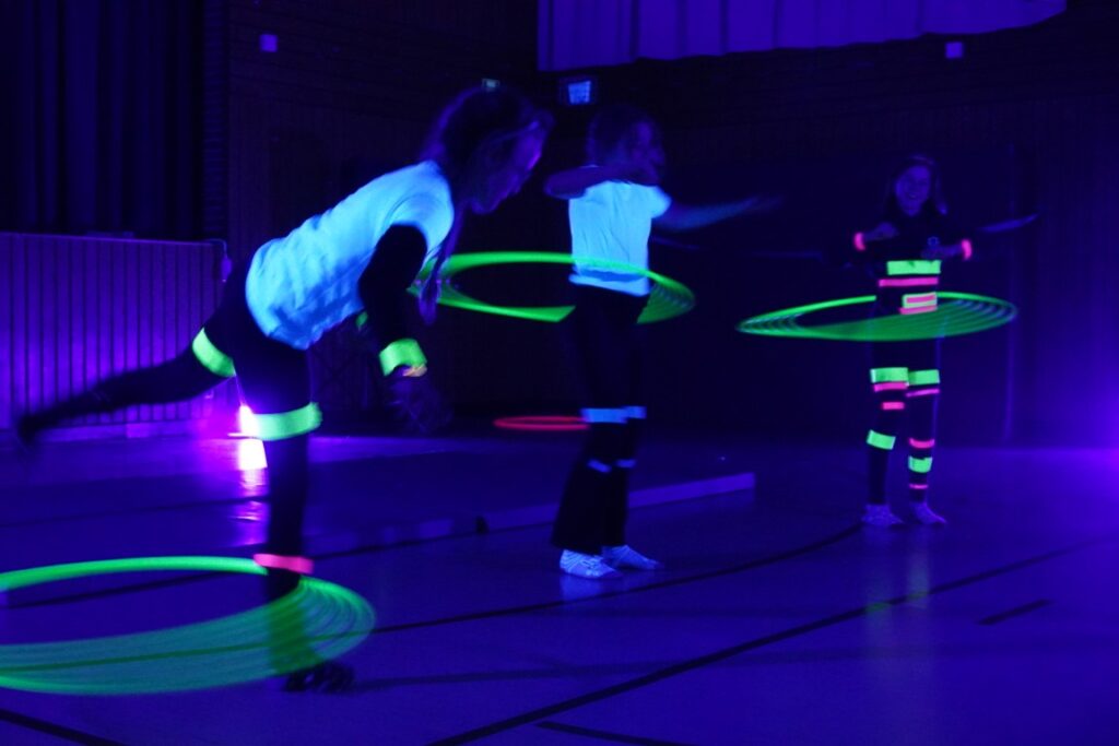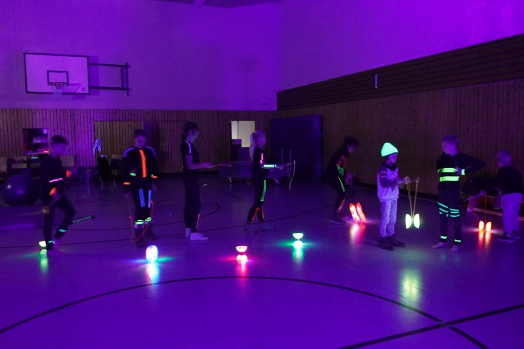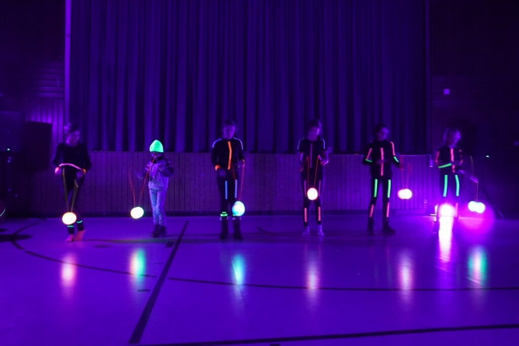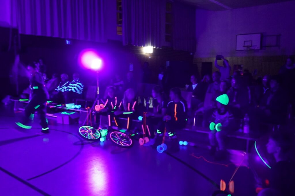 Am Ende des Abends konnten sich die Familien unserer Schüler/innen eine Zirkusvorstellung der ganz besonderen Art ansehen. Dabei standen vor allem die leuchtenden Zirkusmaterialien im Vordergrund und die Zirkusartistinnen und -artisten verschwanden im Dunkeln. Die Zuschauerinnen und Zuschauer waren begeistert: „Mit den leuchtenden Materialien sieht alles noch hundertmal spektakulärer aus.“ Begleitet wurden die Proben und die Aufführung durch Musik der Technik-AG.