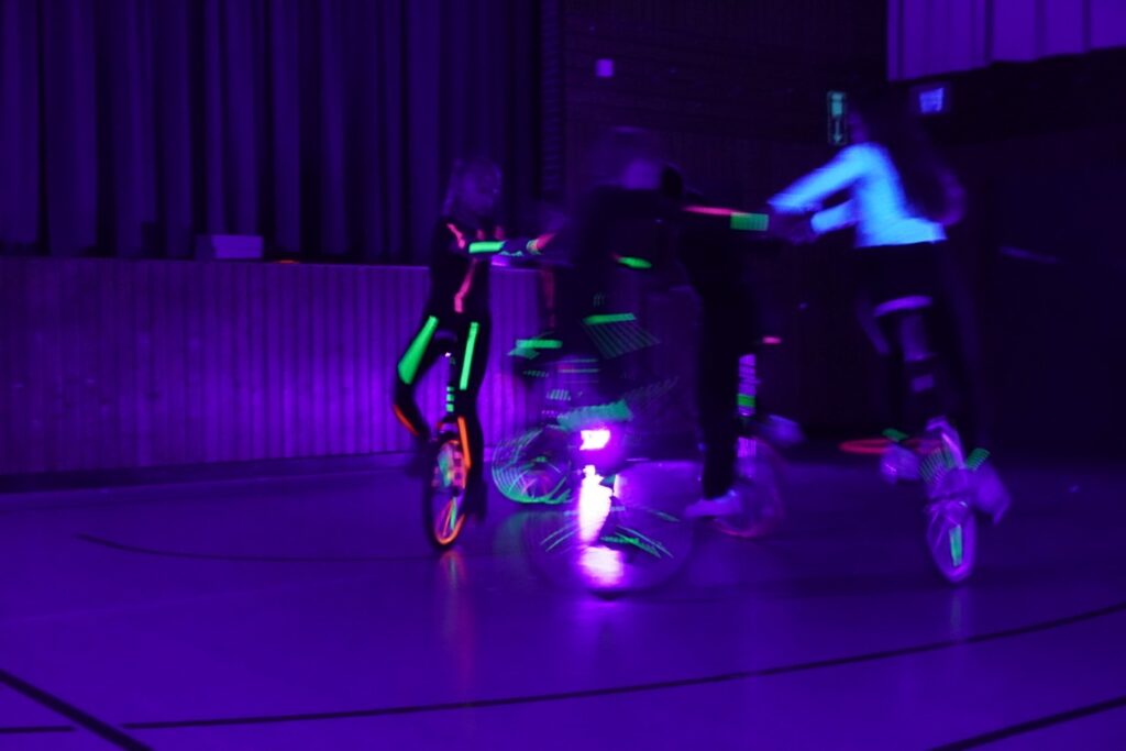 Nachtzirkus – was soll das sein? Und was sollte man nachts im Dunkeln schon Spektakuläres zu sehen bekommen? Wir können euch verraten, dass es eine ganze Menge ist. Zwischen 18 und 21 Uhr sorgten die leuchtenden Zirkusmaterialien in der dunklen Aula durch das aufgestellte Schwarzlicht für einen magischen Anblick. Die Zirkusartistinnen und -artisten probten zunächst begeistert im Dunkeln und ließen strahlende Bälle, Tücher, Flower Sticks und Diabolos durch die Luft wirbeln, drehten scheinende Teller, schwangen leuchtende Pois, fuhren auf mit Leuchtbändern abgeklebten Einrädern, liefen auf leuchtenden Kugeln, klebten ihre Kleidung selbst mit Leuchtbändern ab und drehten Radschläge oder formten sich zu kleinen Menschenpyramiden. Wer in die Aula hineinspähte, sah ein Meer aus bunten Farben und wer noch ein bisschen genauer hinsah, strahlenden Gesichtern. Frau Leiner, Frau Gießen und Frau Bennertz unterstützten die Schülerinnen und Schüler tatkräftig dabei, Neues auszuprobieren und zu lernen und spendierten zwischendurch Pizza zur Stärkung.
